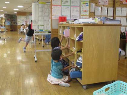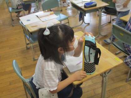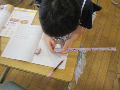 竹ものさしを使って、いろいろな長さを測りました。身の回りの長さに関心をもっています。