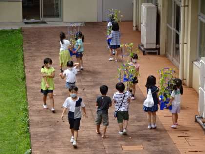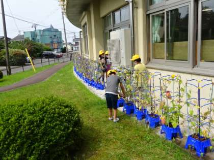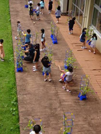みんなで協力して、アサガオを中庭からベランダ側に引っ越しました。