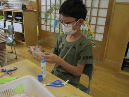 8月7日は七夕ということで、短冊に願い事を書き、七夕飾りを作りました。願い事を書く時には、どの子供も真剣な様子でした。「コロナが早く終わりますように」や「成績が上がりますように」といった子供たちの願いが届いたらよいなと思います。