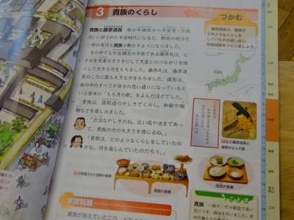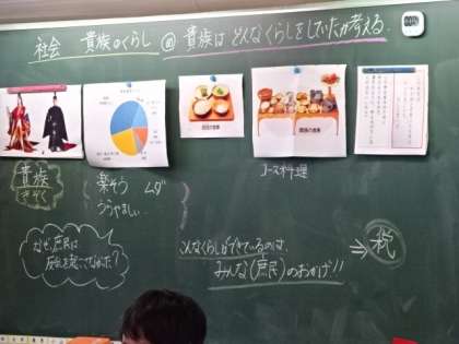 貴族のくらしについて学習しています。貴族が食べていた料理を見て、自分も貴族になりたいという意見も出ていました。
