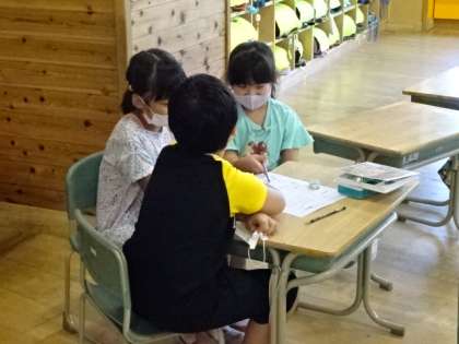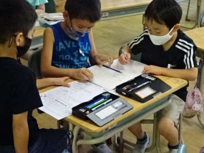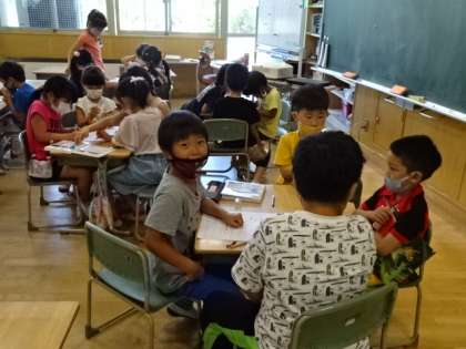 2学期の係で集まって、ポスターをかいています。楽しいポスターにしてね。