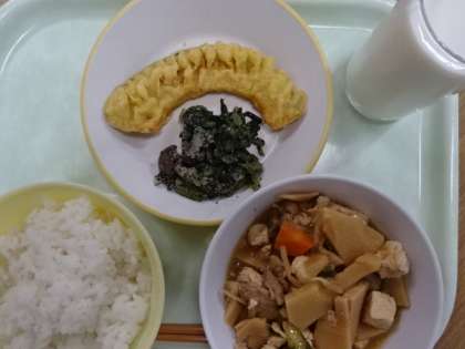 ごはん、牛乳、豆腐のみそ炒め、かぼちゃの天ぷら、よごしでした。