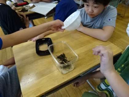 分解者の生物を観察しよう。ということで、ダンゴムシやワラジムシの観察をしています。違いはどこ?