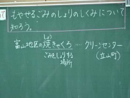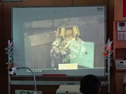 「家庭から出た燃えるごみはどこへ?」今年はクリーンセンターに見学に行けないので、ビデオを使って学習しています。