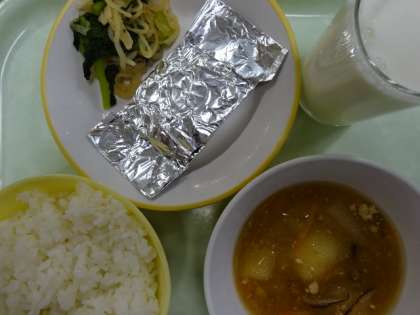 9月最初の給食は、ごはん、牛乳、さんまの銀紙焼き、はりはり和え、冬瓜のそぼろあんでした。
