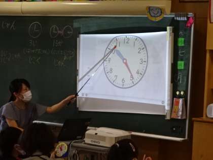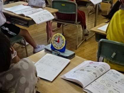 時刻と時間の学習です。実際に時計を動かしながら確かめています。