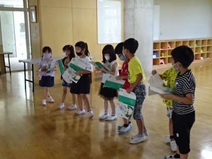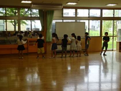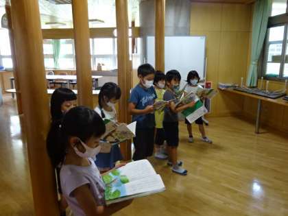 グループで横一列になって、音読の練習です。いつもとは違った音読練習は楽しいですね。