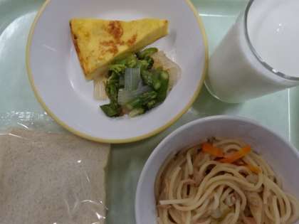 食パン、牛乳、スパニッシュオムレツ、こんにゃくサラダ、ツナとキャベツのスパゲッティでした。
