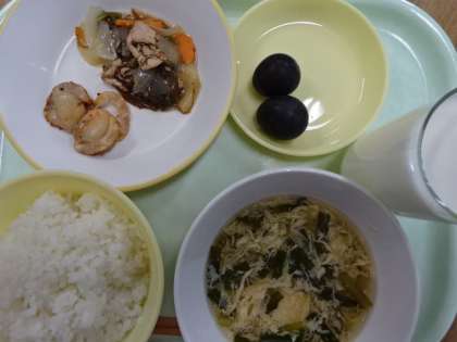 ごはん、牛乳、ほたての香味焼き、もずくのチャプチェ、にら玉汁、巨峰でした。