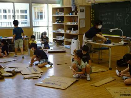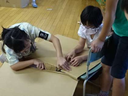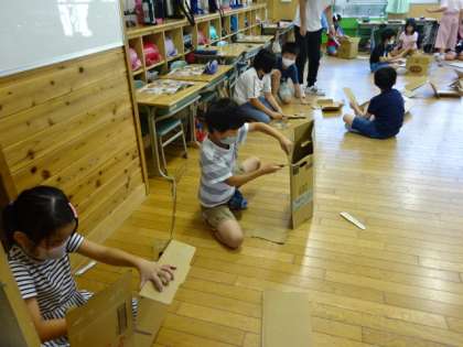 段ボールの板に切り込みを入れ、それを組み合わせて作品を作ります。