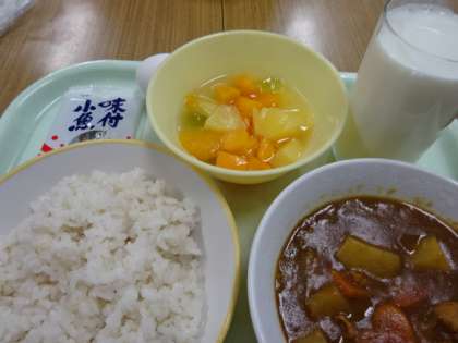 今日の献立は、子供たちが喜ぶ、麦ごはん、牛乳、カレーライス、ゆで卵、フルーツゼリーミックス、味付け小魚でした。