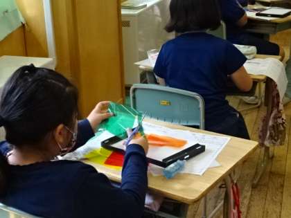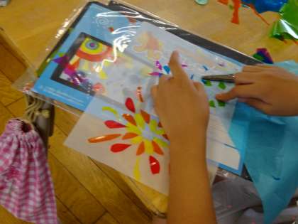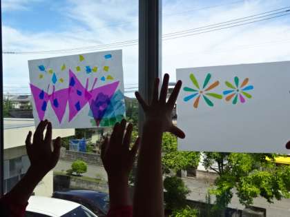 セロハンを上手に組み合わせて、不思議ワールドをつくり出します。窓ガラス越しに見るときれいだね。