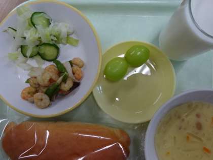 米粉コッペパン、牛乳、えびときのこのガーリックソテー、そえ野菜、野菜ポタージュ、シャインマスカット!でした。