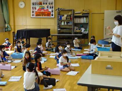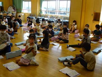 カスタネットやタンバリンをたたいて、みんなで表現しよう。リズムに合わせてね。