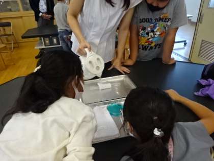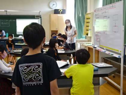 閉じ込められた空気をあたためるとどうなるのか?子供たちは実験結果をもとに、イメージ図を使って熱心に話し合っています。