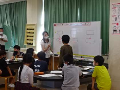 閉じ込められた空気をあたためるとどうなるのか?子供たちは実験結果をもとに、イメージ図を使って熱心に話し合っています。