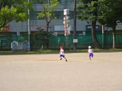 50m走の記録を測定しています。みんなで応援しているからがんばって!