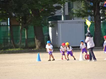 50m走の記録を測定しています。みんなで応援しているからがんばって!