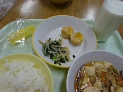 ごはん、牛乳、マーボー豆腐、にんじんシューマイ、ナムル、冷凍パインでした。