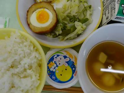 ごはん、牛乳、アスパラソテー、スコッチエッグ、白玉じる、月見ゼリーでした。今年の十五夜は、10/1だそうです。