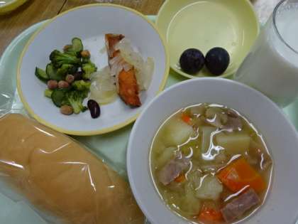 10月最初の給食は、コッペパン、牛乳、鮭マリネ、ビーンズサラダ、野菜のスープ煮、巨峰でした。