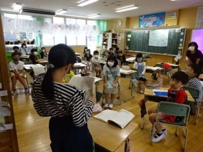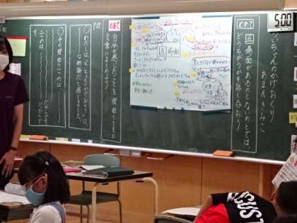 「ちいちゃんのかげおくり」の学習。自分が考えたことをノートにたくさん書き、みんなの前で堂々と発表しています。友達もしっかり聞いています。