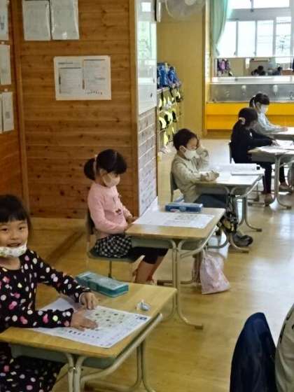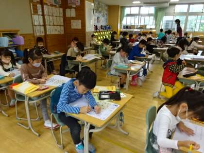 算数のテスト。みんな真剣に取り組んでいます。