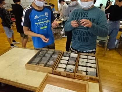 大地のつくり。岩石にはいろいろな種類があるね。おっと、貝の化石が入っているのもあるぞ!