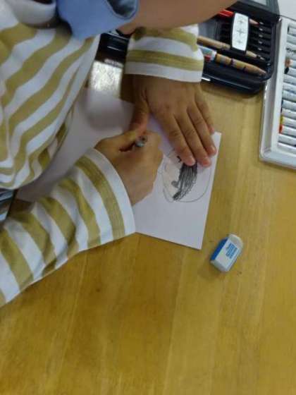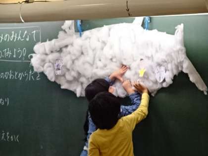 くじらぐもに乗せる、一人一人の顔や姿を描いています。
