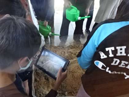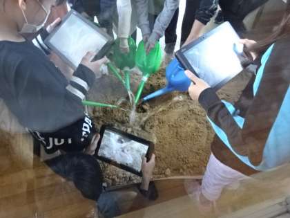 流れる水のはたらきを調べよう。水の量の違いによって、どのような違いがあるのかな?分かったことは、写真に撮っておきます。