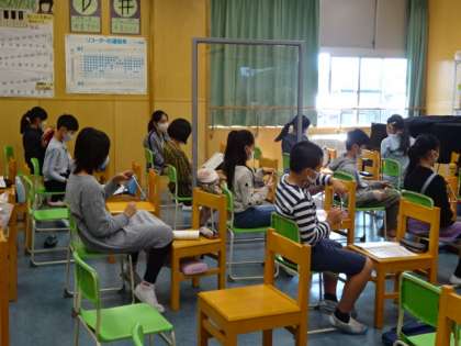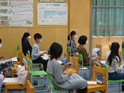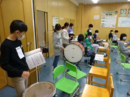 いろいろな楽器を使ってリズム打ちです。自分のレベルに合ったたたき方で挑戦!