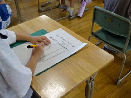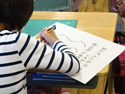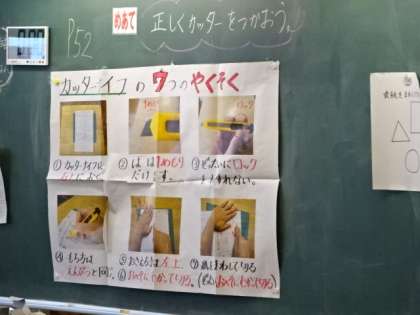カッターを初めて使う2年生。安全に、線に沿って紙を切る練習です。