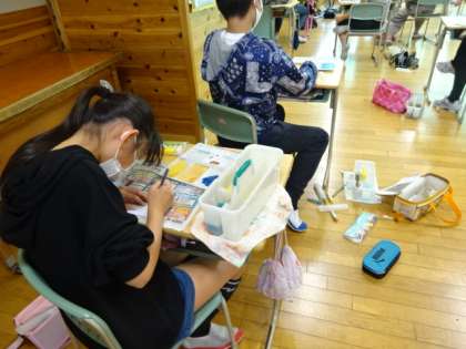 校舎のお気に入りの場所に、水彩で色を塗っています。素敵なアルバムになりそうです。