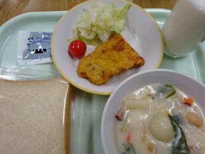 食パン、牛乳、ポークパコラ、ゆでキャベツ、ミニトマト、チンゲンサイのクリーム煮、ブルーベリージャムでした。パークパコラはカレー味でしたよ。