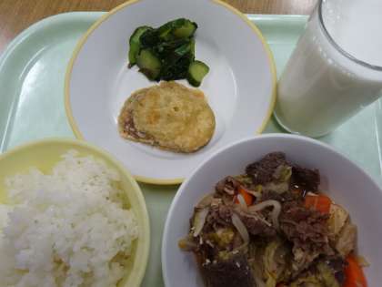 ごはん、牛乳、すき焼き、さつまいもの天ぷら、昆布和えでした。