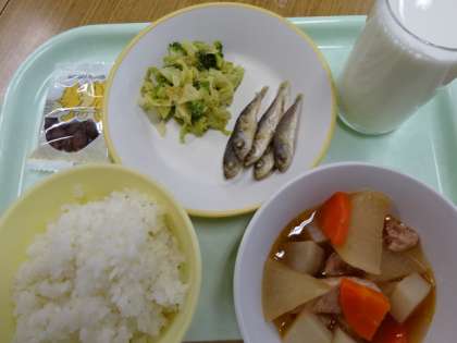 ごはん、牛乳、里芋と豚肉のうま煮、小あじの唐揚げ、ブロッコリーのごま和え、黒糖大豆でした。