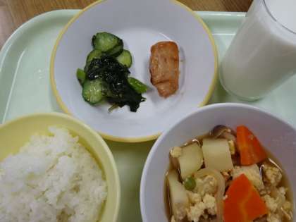 ごはん、牛乳、高野豆腐の卵とじ、鶏肉のバーベキューソース味、海藻サラダでした。