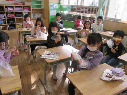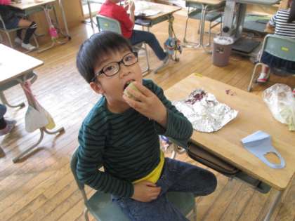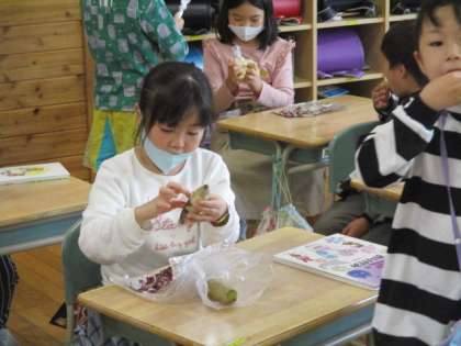 自分たちが収穫したさつまいもで「さつまいもパーティー」を開きました。そのままのさつまいもの味を味わったり、砂糖やバターで味付けをして食べたりするなど楽しんでいました。