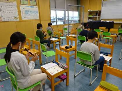 「メヌエット」グループごとにリコーダーの練習をしています。半音上げたり、下げたりが難しい・・
