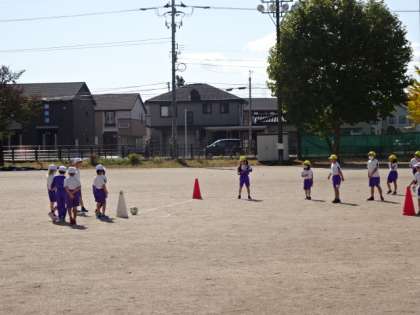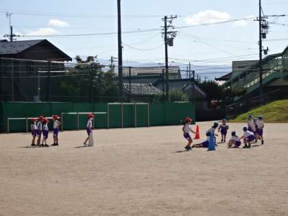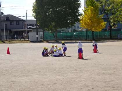 ドーナツ・キックベースボールです。早く円を作らないと、アウトにできません。