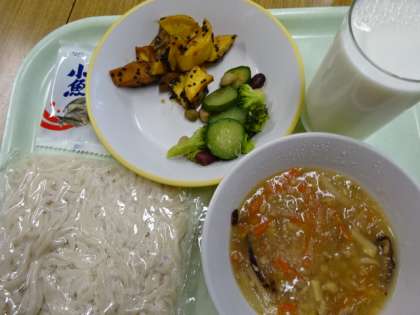 ソフト麺の肉みそかけ、牛乳、大学いも、ビーンズサラダ、味付け小魚でした。