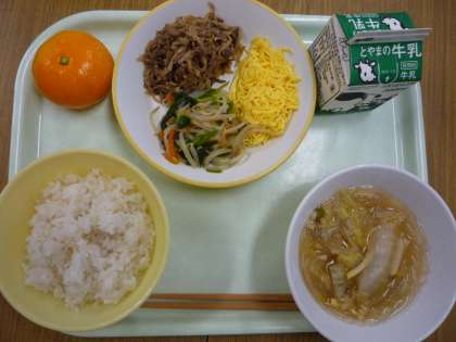 麦ごはん、牛乳、ビビンバ、春雨スープ、みかんでした。