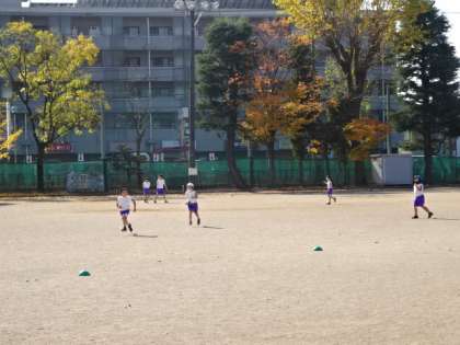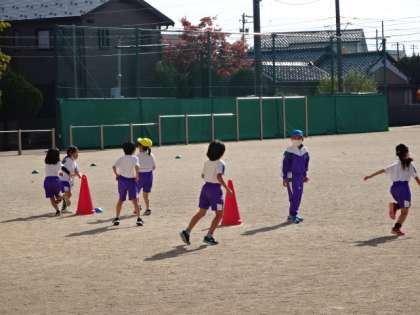 広々とグラウンド全体を使って、おにごっこです。天気がよいので、気持ちよいです。
