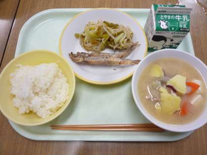 本日の献立は、ごはん、牛乳、ししゃもの米粉揚げ、茎わかめの酢の物、さつま汁です。さつま汁はたくさんのさつまいもと生姜の風味が効いた秋らしい汁物でした。