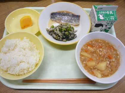 本日の献立は、ごはん、牛乳、にしんのみぞれ煮、よごし、じゃがいものそぼろ煮、柿でした。