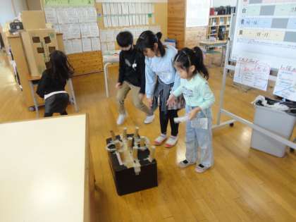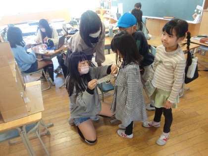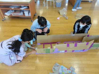 1年生と5年生が楽しく話している様子をよく見かけるようになりました。水曜日のハッピータイムには、1年生を招待し、段ボールで作った遊具で遊んでいました。遊び方を優しく教える、高学年らしい姿が見られました。