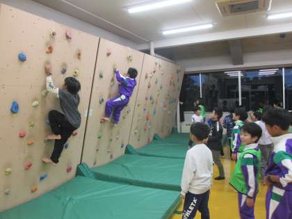 2枚目は、自由遊びです。クライミングに挑戦する子供もいました。他にも、トランプやボードゲームをして過ごし、班の友達との仲を深めている様子も見られました。