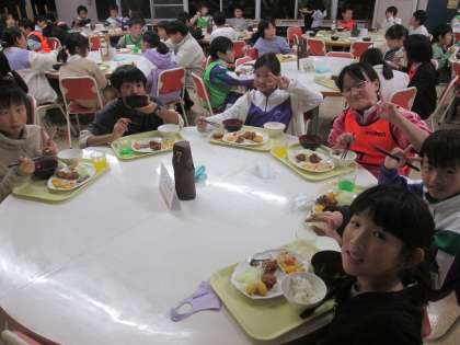 3枚目は、夕食です。所での初めての食堂利用でした。班でテーブルを囲み、笑顔でおいしくいただきました。