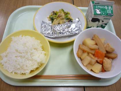 本日の献立は、ごはん、牛乳、鯖の銀紙焼き、しめじのごま和え、関東だきでした。