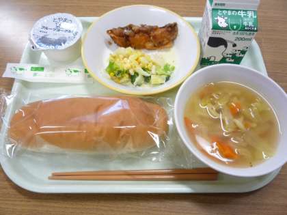 本日の献立は、米粉コッペパン、牛乳、魚の白ねぎソースかけ、白菜サラダ、とやまの野菜カレースープ、ラフランスヨーグルトでした。